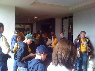 Game Day Friday rose in the East.  After some work and a late breakfast, I headed to the team hotel to meet a friend for lunch followed by the MU Pep Rally.  The East Coast alumni and their families were out en masse as the entire hotel ballroom was ablaze in blue and gold.  The Rachael Ray Show was there to film a segment called “The Final Fork”, featuring Famous Marquette Potters Beans by the superb MU Jamie.  The fans then set up a two-sided spirit tunnel in the hallway to send off the players as they boarded the bus.  Amidst rumors of other suitors, there was no Buzz with the team.  Frankly, it was an odd situation as all the conversation was on the coach and not the game.  As we waited for the bus caravan to load, I made a stop in the men’s room.  Upon exit, there was Buzz right next to me as he popped off the elevator, with Steve Cottingham lingering.  Hmmm…I wonder who was doing the talking?