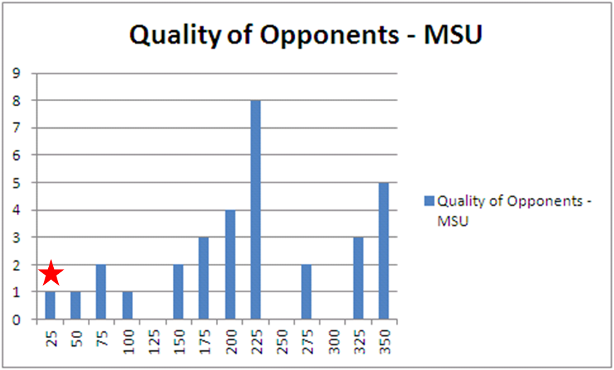 The bottom line/x-axis is the Pomeroy rank of Marquette's opponents by bucket.  It's a ranking by bucket (1-25, 26-50, etc).  The column shows how many opponents by bucket Marquette has played.  For example, MU has played seven opponents ranked as Top 25.  Finally, the red star shows Murray State's place among the rest of MU's opponents.  Murray State would be the sixth 26-50 opponent Marquette plays this year.