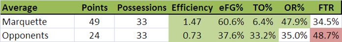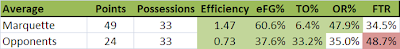 Solid numbers all across the board.  Just about the only area that is worse is our opponents' Free Throw Rate.  Good thing that's practically insignificant to defense.  We also continue to  believe that it's not a sustained defense, but definitely a strong  counter (think first half, Buzz) to an opponent attempting to slow down  the pace.  To the question of if Marquette should press more... yet again the answer comes back "Yes".