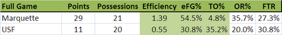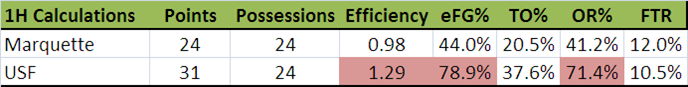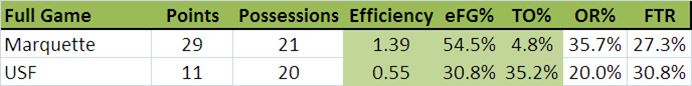 As predicted by Blackheart, Marquette's defense was terrible at such a slow pace.  USF (mind you, a team that averages 1.01 ppp, scored 1.29 ppp in the first half, and had an eFG% of 79%!)  Also, as John Pudner highlighted, USF was all over the offensive boards.  The only good news for MU was that USF was sloppy with the ball.