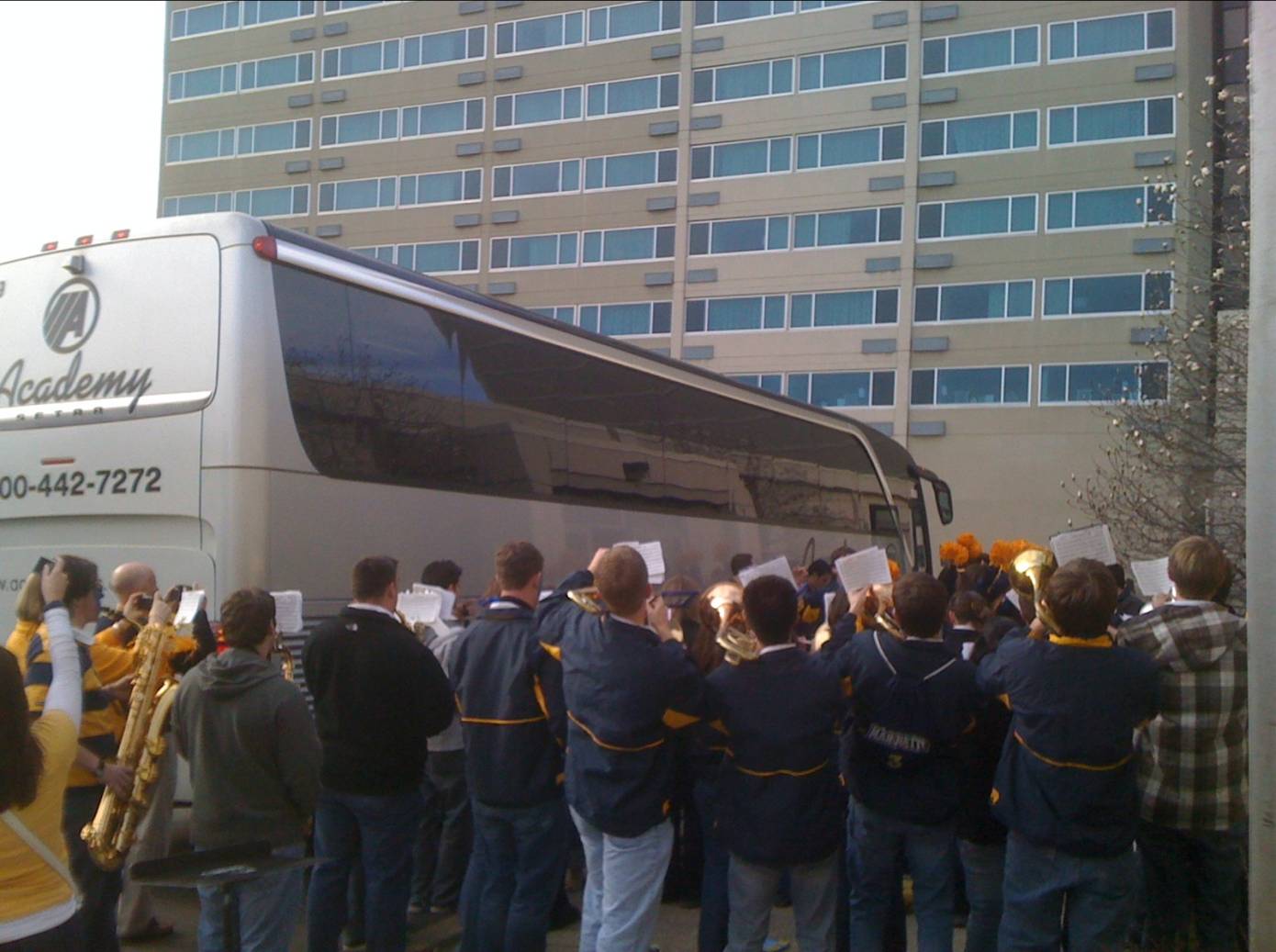 Game Day Friday rose in the East.  After some work and a late breakfast, I headed to the team hotel to meet a friend for lunch followed by the MU Pep Rally.  The East Coast alumni and their families were out en masse as the entire hotel ballroom was ablaze in blue and gold.  The Rachael Ray Show was there to film a segment called “The Final Fork”, featuring Famous Marquette Potters Beans by the superb MU Jamie.  The fans then set up a two-sided spirit tunnel in the hallway to send off the players as they boarded the bus.  Amidst rumors of other suitors, there was no Buzz with the team.  Frankly, it was an odd situation as all the conversation was on the coach and not the game.  As we waited for the bus caravan to load, I made a stop in the men’s room.  Upon exit, there was Buzz right next to me as he popped off the elevator, with Steve Cottingham lingering.  Hmmm…I wonder who was doing the talking?