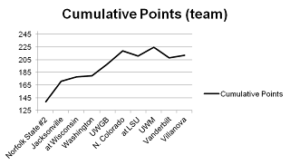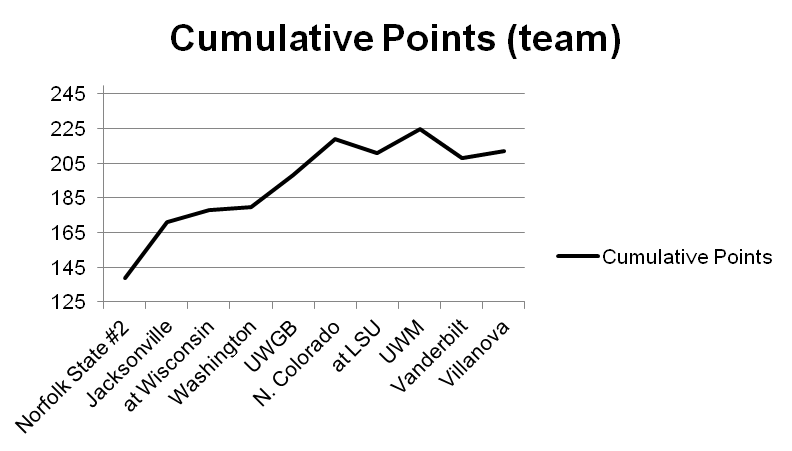 Tonight, Marquette begins a difficult two-game stretch of road games.  Unfortunately, despite the recent conference opening win over Villanova, the Warriors have been slumping.  This chart shows the cumulative total of how many points Marquette has been winning (or losing) by since the second Norfolk State game.
