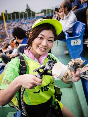 As a frequent resident of Tokyo I followed the infelicitous travails of the Yakult Swallows. The wretched play on the field at Meiji Jingu Stadium was often only redeemed through the earnest efforts of the Swallow Beer Girls. These dedicated lasses ported Kirin, Sapporo, and Asahi in kegs on their backs and distributed that vital nectar to the otherwise forlorn Swallow supporters whose only solace was to be found in the bottom of yet another liter. God bless you Swallow Biru Garu! God bless each and every one of you!