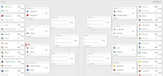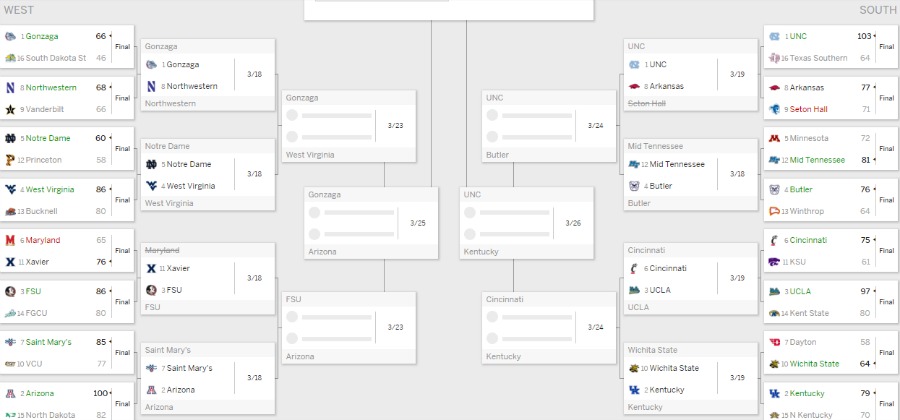 Here is the bracket based on the Value Add bracket which takes the www.kenpom.com rating and adjusts it by any returning or missing players, as explained here. A win in South Carolina just wasn't in the cards.