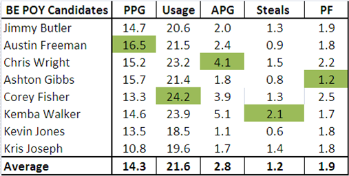 For starters in points per game, where  JFB's average of 14.7 ppg puts him behind Freeman, Wright, and Gibbs but ahead of Fisher, Walker, Jones, Joseph.    The highest returning average in this group is Freeman's 16.5 ppg.   Butler is also also in middle of this pack on assists, steals, and player fouls -- though he averaged more assists per game than Gibbs, a guard, and more steals per game than Freeman or Gibbs.