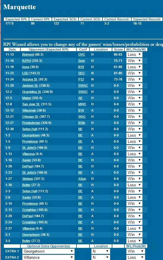 That means it would take a 23-10 record to get an NCAA bid - even one more loss to drop to 22-11 plummets Marquette to 69th in RPI based on the RPI Forecast calculator.