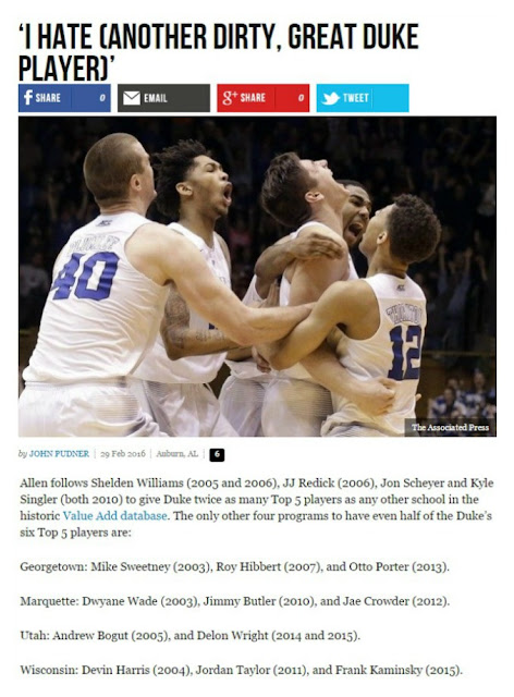 A couple of notes on my piece in Breitbart Sports today. First, it is amazing how efficient Duke players are year in and year out at www.valueaddbasketball.com, and I saw some of the fundamentals in non-conference play and more recently that I believe play out at a higher level as freshman turn to sophomores. So if Wojo is building "Duke North" I will take it along with all the haters who could come with it.